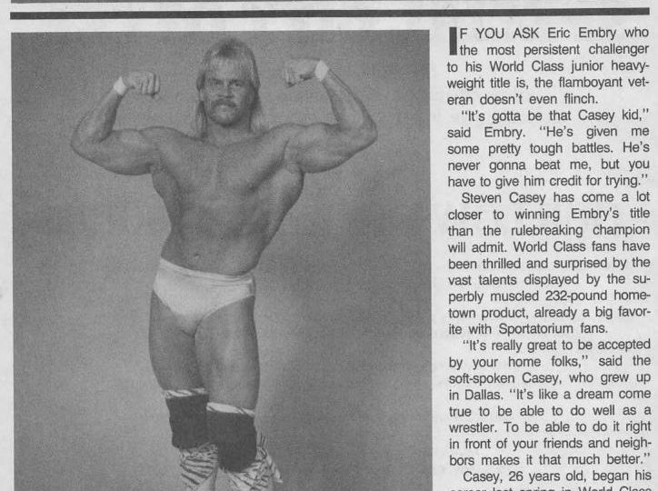 Next, we’re introduced to Steven Casey, a challenger to Eric Embry’s World Class junior heavyweight title. At just 26 years old, the 232 pound Texan has been making a lot of fans. (He was actually 30.) He says he’s just getting started and is taking it one match at a time. (Casey, real name Steven Sasser, went on to have a modest pro wrestling career and died in 2020.)