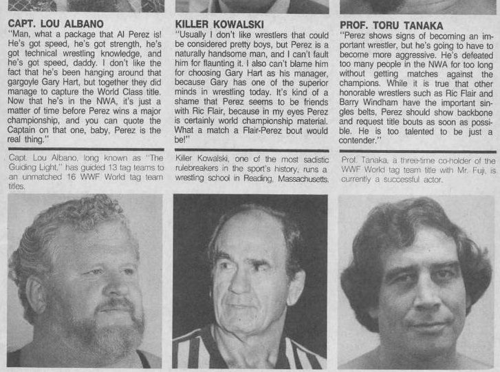Next, it’s Win, Lose or Draw by Andy Rodriguez. He says Bobby Heenan might not be “the Brain” after all. Why? He broke up the Islanders, his best chance to finally win gold in the WWF, to crown Haku (bless you) King. Andy says, “The Islanders were a very good scientific team when they debuted in the WWF a year ago. Heenan saw something in them and encouraged them to change their style. They agreed. For a while, Heenan’s way was working. The Islanders developed a reputation as both good and mean, winning matches with a combination of technical precision and sheer brutality. Along the way, however, Heenan had them doing some strange things like kidnapping the Bulldogs’ mascot, Matilda. Then suddenly, Tama was gone and Haku was ‘King’.” Bobby Duncum, who was coholder of the AWA tag team championship as part of the Heenan Family, says, “Bobby always had too many irons in the fire. That’s always been one of his problems. He figured that if he put a lot of men out there, he’d have to win something. Well, sometimes it worked, and sometimes it didn’t.” Andy continues: “In the AWA, Heenan managed the tag team champions and the World champion at the same time. But after four years in the WWF, Heenan hasn’t won a thing. And with the Islanders breaking up, Heenan no longer has a tag team.” A WWF insider speaking on the condition of anonymity, however, says this might be part of Heenan’s plan. “He’s not a tag team expert like Jimmy Hart is, and he knows it. He’s going back to what he feels he knows best: singles wrestling. He likes the challenge of taking one man and molding him into a champion rather than dealing with two men and two different ways of thinking. The Islanders were like an experiment that failed.” Andy adds, “Failed, that is, in Heenan’s eyes. The Islanders were clearly on their way up. The experiment didn’t fail. It was just never completed.” Andy does concede that the law of averages dictates that if Heenan manages in the WWF long enough, he will eventually manage a winner. “But Heenan doesn’t live by the law of averages,” Andy says. “Has a manager ever lasted so long in an area without winning a title?”