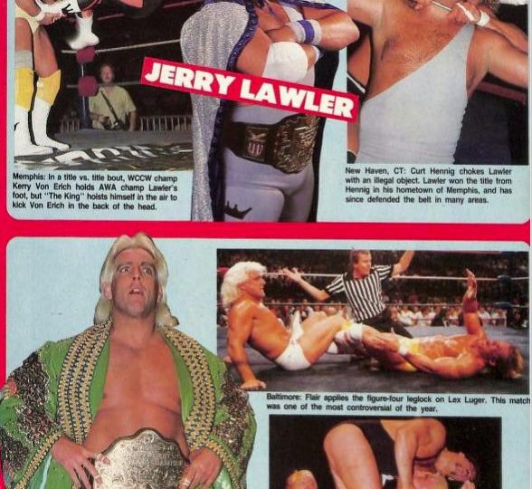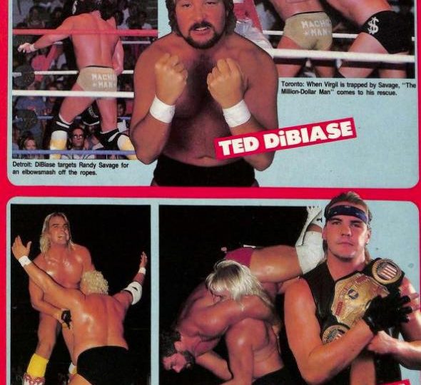 Next, What’s Happening! with Bill Apter… The longest WWF Intercontinental title reign ever has ended! The Ultimate Warrior, subbing for the injured Brutus Beefcake, stormed the ring and pinned the Honky Tonk Man in 31 seconds to win the belt at SummerSlam 88 on August 29 at Madison Square Garden in New York. Honky Tonk won the belt from Rick Steamboat on June 2, 1987 and held the title for one year, two months, and 27 days. (Or over two years according to Billy Graham’s math.) Honky has signed a series of rematches against the Warrior. Elsewhere, Dustin Rhodes, son of Dusty Rhodes, is scheduled to make his pro debut September 6 at the Tampa Fairgrounds on a Florida Championship Wrestling card. In World Class, Kerry Von Erich was carried off on a stretcher after getting mauled by Tommy Rich and Buddy Landell. In Stampede, Brian Pillman injured his right bicep during a match and might require surgery. In the AWA, word is Wendi Richter is coming in to feud with Madusa Miceli. Meanwhile, AWA champion Jerry Lawler has been having trouble defeating Greg Gagne, but has somehow managed to hold onto the title. In the NWA, Ric Flair has similarly been losing to Lex Luger but has been able to hold onto the NWA title. That includes a defeat at the NWA’s first show at the Omni in Atlanta since the July Democratic Convention, which Luger won by disqualification. (Insert your own Dukakis joke.) And that’s what’s happening. See you at the matches!