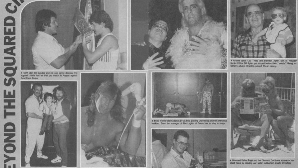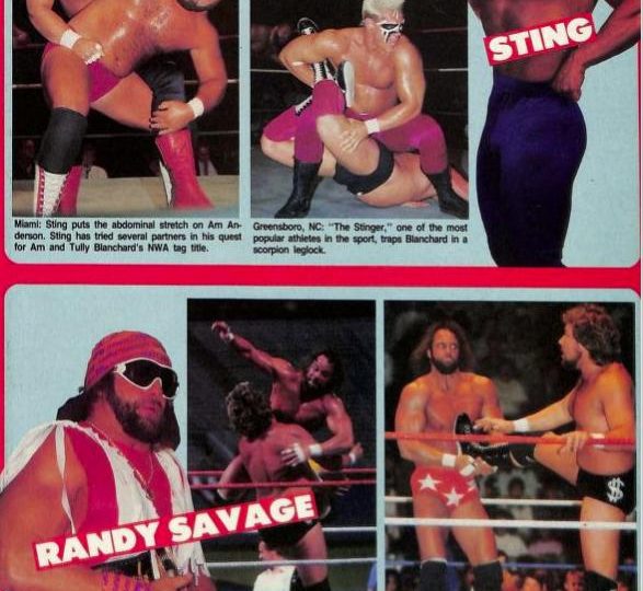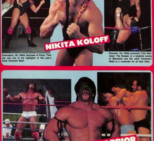 Next, the magazine recaps several “Summer Supercards.” They begin with The Great American Bash, the NWA’s annual series of cards throughout the country, which started on June 26 in Orlando and ended August 7 in Kansas City. There were two title changes: Dusty Rhodes and the Road Warriors won the six-man tag belts from Ric Flair, Tully Blanchard, and Arn Anderson on July 9 in Chicago, and the Midnight Express won the U.S. tag belts back from the Fantastics on July 10 in Baltimore. There were also War Games, and once again the Four Horsemen were losers. Combinations of Dusty Rhodes, Lex Luger, Nikita Koloff, Steve Williams, the Road Warriors, and Paul Ellering scored decisive victories over the Horsemen and J.J. Dillion. Meanwhile, before a nationwide pay-per-view TV audience, Lex Luger appeared to defeat World champion Ric Flair for the NWA title when it was announced that an official from the Maryland State Athletic Commission had stopped the match because Luger was bleeding from the forehead. (There were about two drops of blood, if I remember correctly.) Sadly, this was Flair’s only title defense on the tour.
