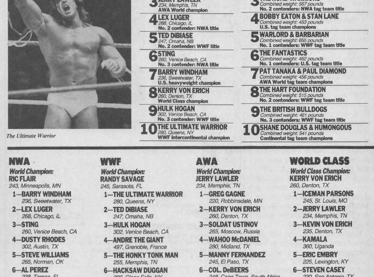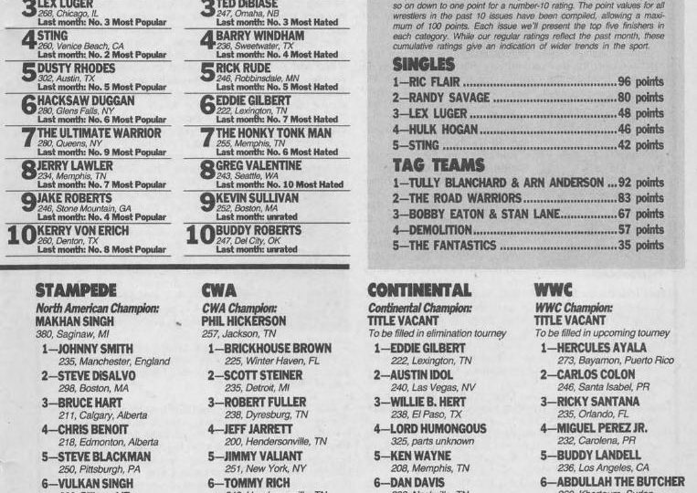 This week, we look back at an issue of The Wrestler that went to press September 1, 1988 that sold for $2.75 in the U.S., $3.50 in Canada, and £1.50 in the United Kingdom. Let’s go straight to the Ratings, where a future WWF champion slips in at #10 in the tag teams under a name and gimmick he’d soon discard.
