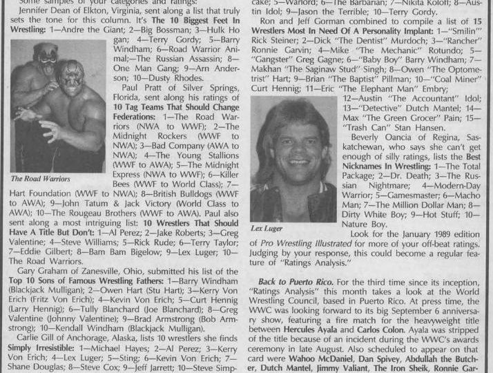 Elsewhere, Kurt from Bethesda, Maryland says Leslie Williams’ letter in the October issue of The Wrestler berating Lex Luger and praising Barry Windham was stupid. For example, Leslie said Barry was more giving than Lex. “If he was such a giving guy, would he have betrayed Luger in such a gross manner? I just wish Ms. Williams knew the facts. Maybe then she could make an intelligent comment.” And Dan from Mayo, Yukon apologizes for responding to the September, 1988 issue so long after the fact, but says “Being in my distant outpost in the Yukon territory, we get our mail rather late.” Dan says a reader wrote in to say the real Bad Company was the AWA tag team and not Brian Pillman and Bruce Hart of Stampede wrestling. “Here in Canada, we take great pride in Stampede wrestling. It’s a great federation, and Pillman and Hart are a great tag team. The only thing AWA’s Bad Company knows how to do is cheat.” (Well, that’s why Diamond and Tanaka were never known as “Good Company.”) Finally, Anthony from Uniondale, New York predicts that the Ultimate Warrior will defeat the Honky Tonk Man for the Intercontinental title.