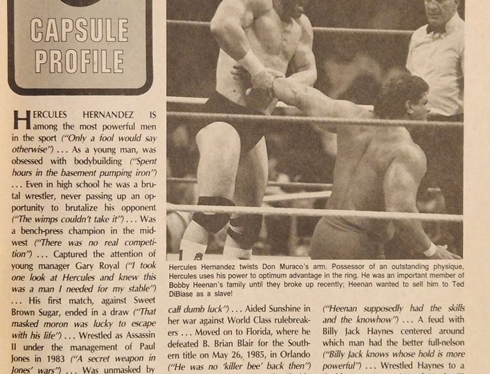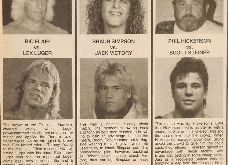 We begin proper with Sincerely Yours, the mailbag column where Amanda from Los Angeles says Inside Wrestling’s Stu Saks was too harsh on Ronnie Garvin. “Saks trashed Garvin’s career solely because of his recent turn against Dusty Rhodes, but I applaud Garvin’s ability to break free of people-users.” Meanwhile, Keith from Charleston has a theory that Austin Idol is one of the hottest stars in wrestling, and he’d like more coverage of the guy. Sandy from Philadelphia says she just loved the baby photo of Hulk Hogan in the October issue and asks for more baby pictures of wrestlers. “Maybe you could even have a special baby picture section.” Then there’s Felecia from Atlanta who says Barry Windham’s defection to the Four Horseman was one of the most tragic incidents in wrestling over the past five years, as Windham had been a beacon of honesty and integrity before being lured away from s righteous path by the promises of riches and fame. “The fact that Windham was able to score a win over his former mentor, Dusty Rhodes, is the biggest tragedy of all, and it proves there is no turning back for Barry.” Meanwhile, Brian from Neenah, Wisconsin says Inside Wrestling has been ignoring Larry Zbyszko and ranking him too low. “I would rank him no lower than fourth in the NWA.” And Lou from Indianapolis says he recently attended an event where Bobby Heenan tried to sell Hercules to the Million Dollar Man as a slave when Hercules rebelled. Later in the taping, Hercules appeared on the Brother Love show and WWF Champion Randy Savage gave Herc a handshake, making him an honorary Megapower! (I’m assuming Elizabeth isn’t included in this deal.) “In offering to befriend the abused Hercules, Savage is opening the door for more rulebreakers to turn good. Once they know they can wipe their slates of evil, I’m more rulebreakers will do so.” Lastly, Mitchell from Berry Hill says he recently attended an interpromotional event where the Samoan Swat Team regained their World Class tag belts from Michael Hayes and Steve Cox and Bad Company defeated the Rock ‘n’ Roll RPMs. “In other words, I got to see some of the biggest names in the business. I can’t wait to see more interfederation cards.”