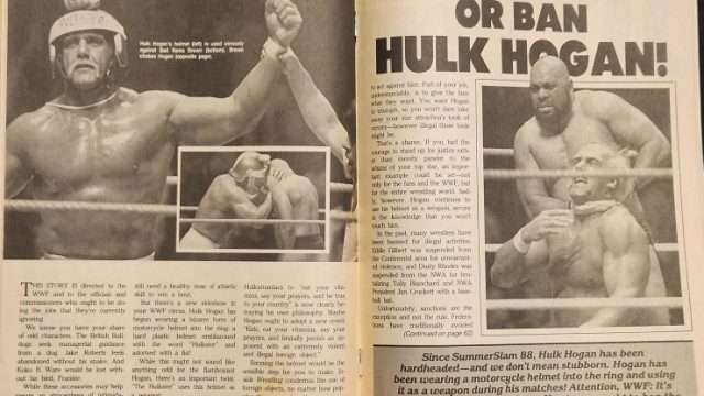 Next, Memo to the WWF: Ban the Helmet or Ban Hulk Hogan! So lately, the Hulkster has been wearing a stupid plastic gladiator helmet adorned with a fist and has been using it as a weapon during his matches. Inside Wrestling says it condemns the use of foreign objects, even when a popular wrestler uses them, and the WWF should have the courage to ban the helmet or even suspend Hogan if necessary. “Rarely has a man who breaks the rules so blatantly been so enormously popular. In a recent match against Bad News Brown, for example, the crowd roared its approval as Hogan first knocked out Brown with the helmet, then pinned him. Any wrestler other than Hogan would have been immediately disqualified, but the Hulkster is the exception. There’s every reason to believe that Hogan, knowing the WWF will never punish him, will continue to use the helmet. This creates an unusual situation: a fan favorite who is the most blatant rulebreaker in the sport. The WWF should, at the very least, ban the helmet. But if Hogan continues his tendency toward extreme rulebreaking, a total ban of Hulk Hogan would be the next logical step. The WWF must act now before it’s too late.” (I can just imagine the letters to the editor for this one. “Hogan only uses the helmet for self defense!” and “What about Jimmy Hart’s megaphone and Slickster’s cane?”)