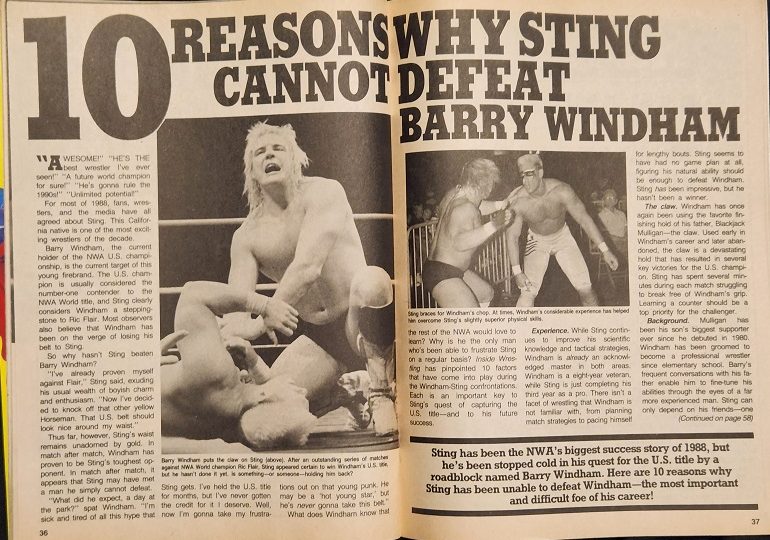 Next, 10 Reasons Why Sting Cannot Defeat Barry Windham. Most fans agree Sting is one of the most exciting new wrestlers of the decade. “A future world champion for sure,” some say. “He’s gonna rule the 1990s,” others proclaim. So when Sting challenged U.S. champion Barry Windham to a series of matches, most people assumed Windham would simply end up as a steppingstone before Sting moved onto bigger and better things, such as another run at Ric Flair’s NWA world title. Yet Sting has been unable to defeat Windham, and Sting remains without a title. Windham, for his part, feels disrespected. “What did he expect, a day at the park? I’m sick and tired of this hype that Sting gets. I’ve held the U.S. title for months, but I’ve never gotten the credit I deserve.” Why is it Windham frustrates Sting on a regular basis? Inside Wrestling has pinpointed ten factors that come into play in their confrontations and illustrate Windham’s advantage.