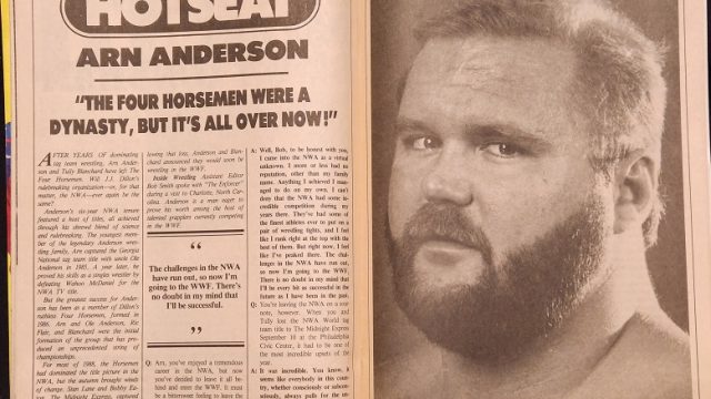 Next, Hotseat with Arn Anderson, with Bob Smith sitting down for an exclusive interview with AA. First, Bob asks Arn about leaving the NWA, and Arn says he’s peaked there, and the challenges in the NWA have run out, so it’s time to move on. When Bob mentions the tag team title loss to the Midnight Express, Arn says it was referee Tommy Young’s fault because Young lost track of the legal men. “When the double-pin came about, it never occurred to Young that I wasn’t the legal man in the ring at the time. The entire situation was not only dishonest, but it was clear favoritism for those guys.” Asked if the other Horsemen are angry that he and Tully are leaving, Arn says, “No, we haven’t created any animosity that I know of. Ric isn’t happy about it because we’re best friends, but Tully and I are seeking new horizons. You have to broaden your career.” Bob then asks what Arn and Tully expect to happen in the WWF, with so many great tag teams vying for one title. Arn says he and Tully expect to win and work their way up the ladder before toppling Demolition. “The only way to get a title shot is to prove ourselves. We’re prepared for anything we have to do. The cream will always rise to the top.”