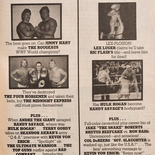 Next, an article about the Megabucks and Megapowers and Megaconfusion. Specifically, the magazine looks at the mixed up, muddled up, shook up world where faces become heels and heels become faces. We first get a history lesson. While many fans know Randy Savage was once a hated figure and Andre was once a gentle giant, what the WWF doesn’t want you to know is that Hulk Hogan himself was also once a vile rulebreaker and Ted DiBiase was once a good natured fan favorite. But what about the future? Will we see more twists and turns, breaking up the Megapowers and/or Megabucks alliances? Inside Wrestling analyzes each of these men and makes some prognostications.