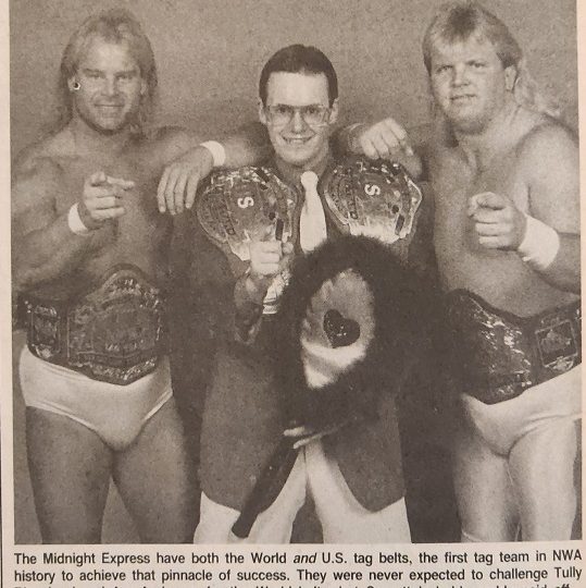Next, it’s On Assignment with Liz Hunter, who recounts one morning when someone was knocking on her door. It was 4:30 a.m. and the knocker was a courier of Jim Cornette’s who gave Liz a letter. It said, “How nice to be with you this morning, if only by mail. Mother and I will be down tonight, and we insist you join us for dinner. A car will pick you up at 7 p.m. Under your name there is a selection of formal gowns in the Chanel section of Saks. Take whatever you’d like. We have lots to talk about. Jim.” Liz, wondering what this was all about, went down to Saks Fifth Avenue and selected four dresses for $14,450. She then went directly to refunds, returned them, and donated the money to the Multiple Sclerosis Foundation. Later that night, she met with Mama Cornette and her boy. “So what’s up?” Liz asked, knowing Jim must have wanted something. “Why the dinner? Why the gowns? What do you need?” Mama Cornette spoke up: “My brilliant son is superstitious.” Then Jim Cornette jumped in. “Tomorrow, my Midnight Express will fight for the NWA World tag team title.” Liz already knew this, but she tried to play along. “So?” she asked. But Jim had his own question: “Do you know what you were doing on February 1, 1986?” Liz thought for a moment. “I was outside looking at my shadow,” she replied. Jim said, “No, you were in Atlanta dining at Bugatti with Mother and myself. The next night my Midnight Express defeated the Rock ‘n’ Roll Express for the NWA World tag team title.” Liz started to understand what this was all about. “But the Express are a different team now than they were in ’86,” she said. “And Blanchard and Anderson have little in common with Morton and Gibson.” Mama Cornette sighed. “Don’t even bother,” she said. “I told him all the good luck in the world won’t pin Blanchard, but he won’t listen to reason.” However, the next night, the Midnight Express defeated Blanchard and Anderson to win all the gold. And the day after, Liz received a bouquet of flowers along with a note: “Dear Liz,” the card read, “thanks so much for joining us for dinner.”