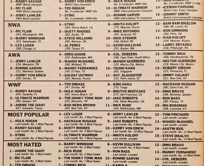 Greetings all! Today is the anniversary of the Friday, February 3, 1989 Main Event that aired on national TV featuring the Megapowers breakup. I was there, and when Jesse mentioned “the frozen tundra of Milwaukee, Wisconsin,” he wasn’t kidding. It was about 0 degrees out. And guess what? It’s nearly the same right now here in southeastern Wisconsin! Anyway, this week we look back at an issue of Inside Wrestling that went to press in October of 1988 that sold for $1.95 in the U.S. and $2.50 in Canada. In this issue, Eddie Ellner names the winner of his contest where fans were asked to write essays describing the most historical wrestling moment in history. But first, let’s go straight to the Ratings.