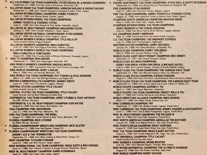 In other tag team news, Jerry Stubbs and the Dirty White Boy were awarded the CWF tag team title when Shane Douglas, who held the belts with Humongous, left the federation. And the Terminator, teaming up with former Sheepherder flagbearer (and future WWE head of talent relations) Johnny Ace, won the Florida Championship Wrestling tag team title from Mike Graham and Steve Keirn in Tampa. In Stampede, Chris Benoit and Lance Idol are hot on the heels of Stampede tag team champions The Cuban Commandos. In All-Japan, David Sammartino has been teaming up with The Destroyer.