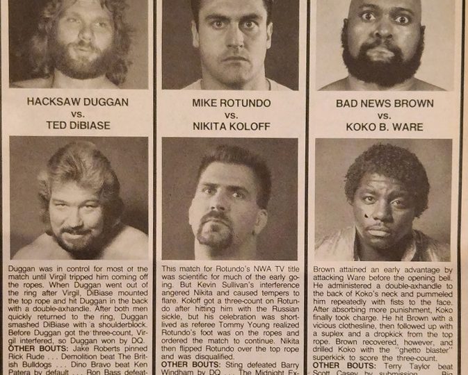 Matt then reports from Philadelphia, Pennsylvania. “Little Red Rooster? Akeem? I thought the WWF had gone about as low as it could go when Elizabeth removed her skirt exposing a pretty shapely pair of gams, but this is too much,” he says. “Why is Terry Taylor calling himself Little Red Rooster? How did the One Man Gang become African? Where does Bobby Heenan get off trying to sell Hercules Hernandez as a slave? And who’s the jokester who decided a televised match needed an inset interview with Matilda where all she did was bark? Maybe someone thought it was cute, but if you ask me, the WWF has become a little too cute. Which brings me to the whole point of this little diatribe: the defection of Tully Blanchard and Arn Anderson to the WWF. To me, this is worse than Peggy Flemming joining the Ice Capades. How can two serious wrestlers like Blanchard and Anderson do this? To me, Blanchard and Anderson epitomized what the NWA was all about: no-nonsense, exciting, dirt-under-your-fingernails wrestling. What does Vince McMahon Jr. plan to do with these two?