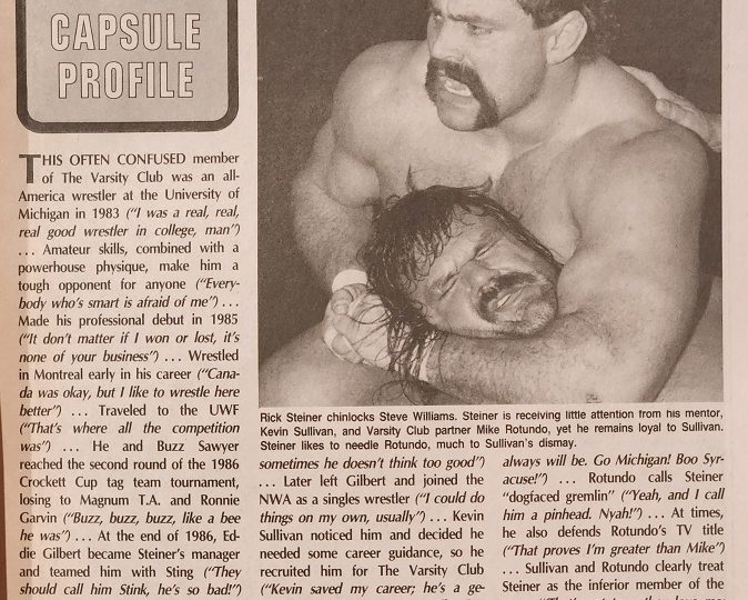 Next up, The Insider with Eddie Ellner, where Eddie is happy the Road Warriors are no longer pandering to the fans and have re-embraced their rulebreaker roots. He says the truth is the promoters were trying to take advantage of the Warriors by having them sign autographs, appear at charity benefits, and attend store openings. As one fan notes, “They were born and bred to destroy, not sign autographs.” Hawk himself said things had gotten ridiculous. “Suddenly, we’re wrestling alongside a tub of lard like Dusty Rhodes and hanging around with knuckleheads like Sting and Luger.” But don’t expect the Warriors to become friends with people like Windham and Flair. Animal says, “Problems start when you get involved with other people. We don’t need anyone but ourselves. We read the magazines. People wonder why we’ve never won the NWA tag team title. Let our actions speak for us. Soon it will be just like the good old days.”