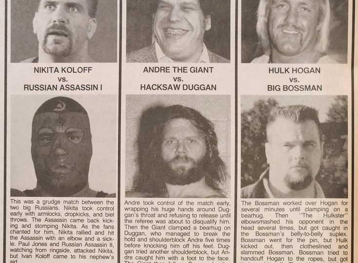And now, News From the Wrestling Capitals, where a correspondent reports that a smiling Andre the Giant continues to dominate Hacksaw Jim Duggan.