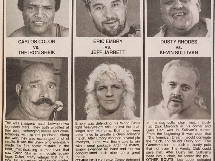 And finally, Paul E Dangerously and Jim Cornette verbally spar in One on One. Dangerously begins by noting that Bobby Eaton and Stan Lane are really just substitutes, and that he is now the manager of the real Midnight Express, the originals, Dennis Condrey and Randy Rose. Cornette says Condrey and Rose are washed-up turncoats. “I know those boys are of limited intelligence, but I guess that makes them the perfect match for you.” As for Eaton and Lane, Cornette says they aren’t substitutes, “They’re world champion wrestlers!” Cornette also adds that Dangerously’s pants keep falling down because he doesn’t own any belts. Dangerously says he’s not even in the NWA yet, but that will soon change. “I’ll admit I made some mistakes in the past, but not anymore. My men will soon have those tag team belts wrapped around their waists and you’ll be running and screaming around the ring with that tennis racket of yours. Just remember, Jimbo, there’s only one Midnight Express, and I’ve got them. Start packing your bags, buddy boy, and shine up those belts, cause they’ll be ours before you know what hit your sorry selves.”