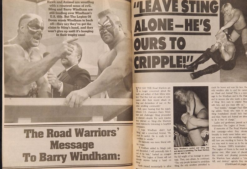 Next, the Road Warriors have a message for Barry Windham: “Leave Sting alone—he’s ours to cripple!” Hawk puts it in these terms: “If Windham adds to Sting’s pain and discomfort, I will personally take it out on his hide. The only people licensed to annihilate Sting, the only wrestlers permitted to crack his bones and scar his face, the only wrestlers able to end his career are Hawk and Animal.” Animal adds, “We’ve been resisting our impulses for too long. It’s our blood to beat, break, and batter. We have our targets, and the will pay.” In fact, it was a six-man tag team match where the Warriors were teaming with Sting when fans first learned of this new attitude. The Warriors and Sting were wrestling the Varsity Club, comprised of Kevin Sullivan, Mike Rotundo, and Rick Steiner, when Hawk and Animal turned against their partner and beat him senseless. “It was nothing against Sting personally,” says the Warriors’ manager, Paul Ellering. “He’s just the current object of their wrath. When he’s dispatched, my men will select another pawn to crush.” In fact, Dusty Rhodes was supposed to be the one teaming up with the Road Warriors but had to bow out to appear at a charity fundraiser. “I get sick just thinking about Rhodes,” says Hawk. “After we make chopped meat of Sting, we’re going after that fat old man.” Sting, meanwhile, is still mystified. “I realized something wasn’t right when they refused to tag me, but I had no idea they planned to attack me.”