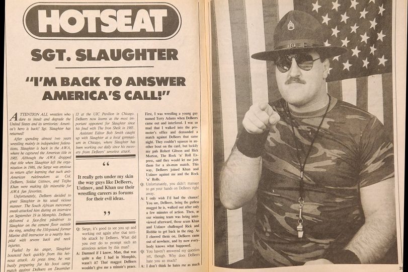 We move on to Sgt. Slaughter in the Hotseat, taking questions from the Inside Wrestling staff. The first question: why does Col. DeBeers hate him so much? “I don’t think he hates me as much as he hates the United States of America, my friend. He hates my patriotism. He’s as outspoken against America as I am patriotic. There’s just no way we can both exist in this country. DeBeers says he doesn’t like it here, so he really ought to heed that hallowed old expression, ‘love it or leave it’! It really gets under my skin the way guys like DeBeers, Ustinov, and Khan use their wrestling careers as forums for their evil ideas.” Asked about his feelings toward the AWA discontinuing the Americas title the Sarge held, Slaughter says, “I was angry about it. I was on tour all over the country when I found out that the AWA had dropped the title because of what they called ‘a lack of title defenses.’ What they didn’t realize was I was putting the belt on the line against top opponents all over the place, but out of AWA boundaries. But I kept the belt, and as far as I’m concerned, I’m still the Americas champion. A lot of independent federations still consider me the champion too. I’ll bet the fans feel the same way.” Asked why he hasn’t tried to return to the NWA or WWF, Sarge says, “Mainly because I want to reach out into the towns and cities that the bigger organizations don’t seem to care about anymore. I want to meet and talk to people, the kids, and the veterans in a lot of places that some people never get to see.” Asked about the Boot Camp match at SuperClash III, Slaughter says “We’ll both be allowed to wear anything we want to the ring, and we can use anything we want against each other. I’ll have Old Glory and my steel-tipped boots with me, just like I did when I wrestled the Iron Sheik in those boot camps matches a few years ago. Just remember, that whenever the fans need me, I’ll be there to wipe out the men they hate. You got that civilian? You’re dismissed!”