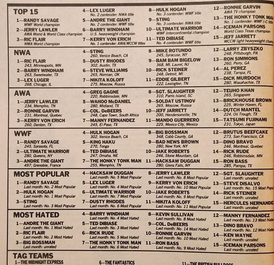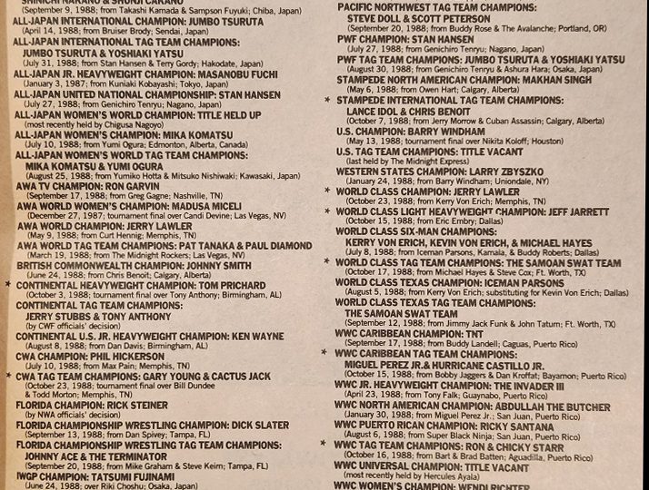 This week we look back at an issue of Inside Wrestling that went to press October 27, 1988 that sold for $1.95 in the U.S. and $2.50 in Canada. Plus, I give you bonus coverage from The Wrestling Observer from the same timeframe! This time around, we’re told about a new World Class champ, and we learn about an impending match between two future WWF champions. But first, let’s go straight to the Ratings, where for the first time in over five years, the AWA champion is rated above the NWA champion.