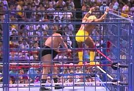 The opening exchanges are mostly built around both wrestlers using Hogan’s t-shirt to choke one another, which is about as exciting as it sounds. Andre eventually uses the shirt to tie Hogan to the cage wall and gets some shots in before heading for the door, but Hogan is able to get free and brings Andre back in with some punches. Things pick up a bit once we’re past the shirt choking, with Hogan even taking a bump off the second rope when trying to escape and Andre leaving his feet with an elbow drop at one stage.