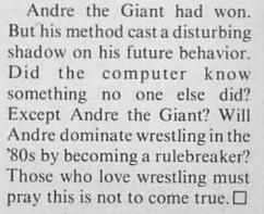 The results as determined by an advanced AI computer: Stanislaus Zbyszko defeats Larry Zbyszko. The Steiner Brothers defeat the Tolos Brothers. Gorgeous George defeats Johnny B. Badd. Mil Mascaras and Antonino Rocca wrestle to a one-hour time-limit draw. Tiger Mask defeats Jushin Liger. Hulk Hogan defeats Billy Graham (by DQ). Bruiser Brody defeats Cactus Jack in a steel cage match. In the Battle of the Mega-champions featuring Buddy Rogers, Ric Flair, and Nick Bockwinkel versus Lou Thesz, Bob Backlund, and Bruno Sammartino, the good guys win when Bruno catches Flair in a bearhug and squeezes the breath out of him. Then in a match pitting Dory Funk Sr, Dory Funk Jr, and Terry Funk versus Fritz, Kerry, and David Von Erich, both teams are disqualified. Finally, there’s a 20-man Battle Royal featuring Dusty Rhodes, Jack Brisco, Pedro Morales, Sting, Chief Jay Strongbow, Edouard Carpentier, Don Leo Jonathan, Stan Hansen, Randy Savage, The Sheik, Freddie Blassie, Rick Steamboat, Andre the Giant, Bobo Brazil, Jerry Lawler, Whipper Watson, Sting (again), Ivan Koloff, Lex Luger, and Harley Race. (Hey, that’s not fair! Why does Sting get to be in it twice?) The match comes down to Carpentier, Andre, Sheik, and Jonathan as the final four before a couple more eliminations leaves Jonathan alone against Andre one on one. Jonathan then picks Andre up over his shoulders for the “Mormon spin” and after 12 complete spins, let’s go to watch Andre fly over the top rope, injuring 11 spectators and giving Don Leo Jonathan the win. (Did Jonathan write this article?)