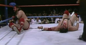 After Tatsumi Fujinami, the IWGP champion, shows up for no adequately explained reason, Wahoo and Manny start trading chops and the crowd could not care less, which is really sad because Manny was only a year removed from being half of the NWA World tag team champions. And since this is a strap match, they do the same ending they always do in strap matches and battle for three corners before the heel accidentally shoves the babyface into the fourth one for the win at 7:45. * Manny attacks Wahoo afterwards, but Fujinami (“the Japanese champion” according to our announce team) makes the save.