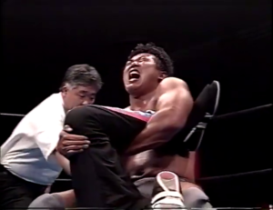 Both teams gets the same entrance music and I have no idea why or why they couldn’t fix it for the VHS release. This was set up by the chaos from last month’s show so the Takanos take it to the bigger lads outside the ring before the match properly starts. This means Shunji starts off pounding away on Yatsu which is not what any sane individual wants to see. So of course we see it for bloody ages as Yatsu gets sent into the guard-rails and continues to let both The Good Takano and The Bad Takano work him over. Yatsu and George mis-time a side suplex to mild laughter from the crowd as Haku enters the ring to reminds everybody to shut the fuck up when he’s around. George gets a Missile Dropkick before Yatsu dodges a spin-kick and finally tags in Haku to a hero’s welcome, before the Takanos double dropkick him to instantly cut off his momentum. Haku then takes Yatsu’s place absorbing all of the Takanos’ moves as I wonder what’s up with this match. Haku has to tag out to Yatsu to come in and get the first bit of offence on the Takanos by breaking a chair over his head. Takano grabs the bottom rope to break the hold so Haku stomps his hand from the apron. That was cute. Haku lands a spectacular piledriver that Shunji has to break up to big boos. The Natural Powers were heel but everything in this match is saying otherwise. Yatsu bodies George some more with Shunji getting a more negative response the longer this goes on. Glad the crowd are realising he’s as useless as Worf in Next Generation whenever a new character shows up. Haku blocks a Sunset Flip with a chop, a kick and finally a spit and the crowd loves it. Haku’s too likable to boo. Shunji gets the tag and connects with his top rope knee drop on Haku but doesn’t go for the pin because he’s crap and dumb, so Haku heads outside for a breather leading to the massive George diving over the ropes and splatting both of them. Shunji lands a top rope dropkick but they’ve had enough and The Natural Powers land a powerbomb/elbow slice combo with George bravely saving his dumb brother. So George takes the same double team to send him rolling outside, with The Naturals hitting the same double team yet again on Shunji to end it.
