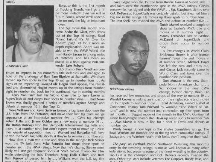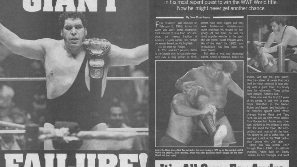 Next, an article about Andre the Giant, who has wrestled 18 years and managed to win just one world title—which he held for less than two minutes. Today he’s a shell of himself. Retire his trunks. Get out the gold watch. Hire the caterer. A career that once held so much promise is now ending with a giant thud. Terry Funk says it’s sad. “He was one big, tough sucker back when I wrestled him, but he just couldn’t win the big one. He had the ability, but some people choke under pressure. Maybe Andre just couldn’t handle it.” Ernie Ladd, however, thinks Andre can still bounce back. “Look, he’s bigger now than before, and a lot of people think he had Hogan pinned at WrestleMania III.” Bruno Sammartino, meanwhile, says, “Let me tell you something, it’s sad to see a wrestler at the end of his line, but it’s tough to leave this game. I know what Andre’s going through. He loves the sport, he wants a world title, and he doesn’t know any other way of life.” (Y’know, I don’t think I’d have the guts to publish this article in 1989. What if Andre stomped into my office and asked to speak to the writer?)