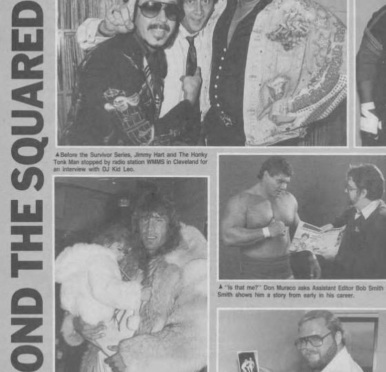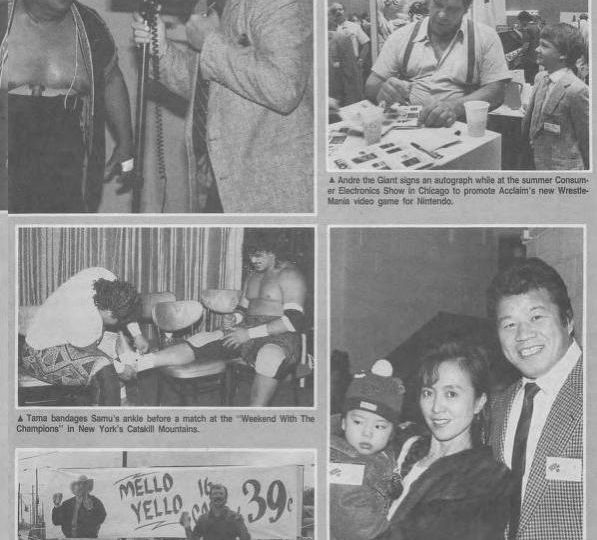 Above: Jimmy Hart and Honky visit a Cleveland radio station, Kerry Von Erich carries his daughter at SuperClash III, Don Muraco looks at a photo of himself in a magazine, and Arn Anderson looks at The Wrestler’s photo archive. Below: Abdullah the Butcher gets photographed by Gary Hart, Andre signs an autograph at the Consumer Electronics Show in Chicago to promote the Wrestlemania Nintendo video game, Tama bandages Samu’s ankle before a match, Tatsumi Fujinami gets a photo with his wife and baby at SuperClash III, and photographer Floyd gets his picture taken while standing in front of a Dusty Rhodes Mello Yello stand.