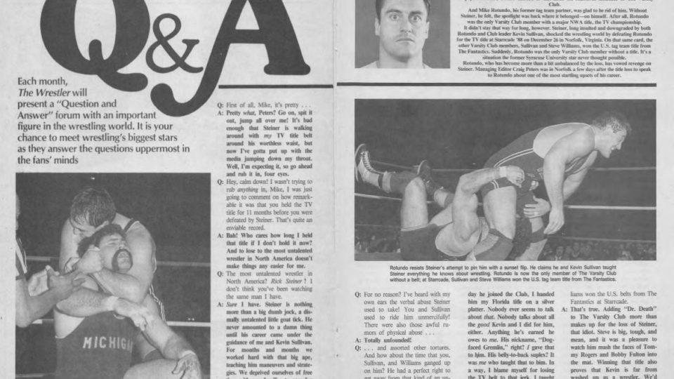 Next, it’s Q&A time with Mike Rotundo(a), who just lost his TV title at Starrcade to Rick Steiner. Rotundo is surly and says Steiner is an ungrateful idiot, but now Dr. Death Steve Williams is in the Varsity Club, and the Club has a plan for revenge.