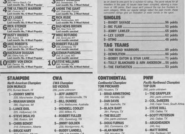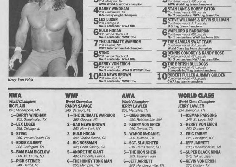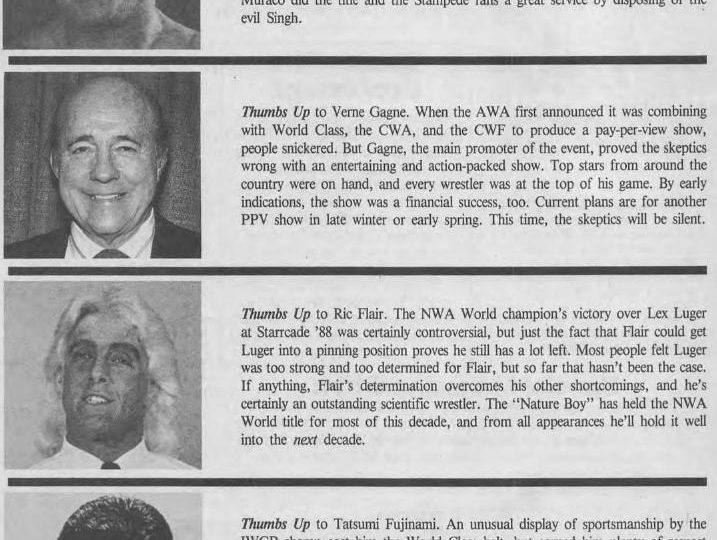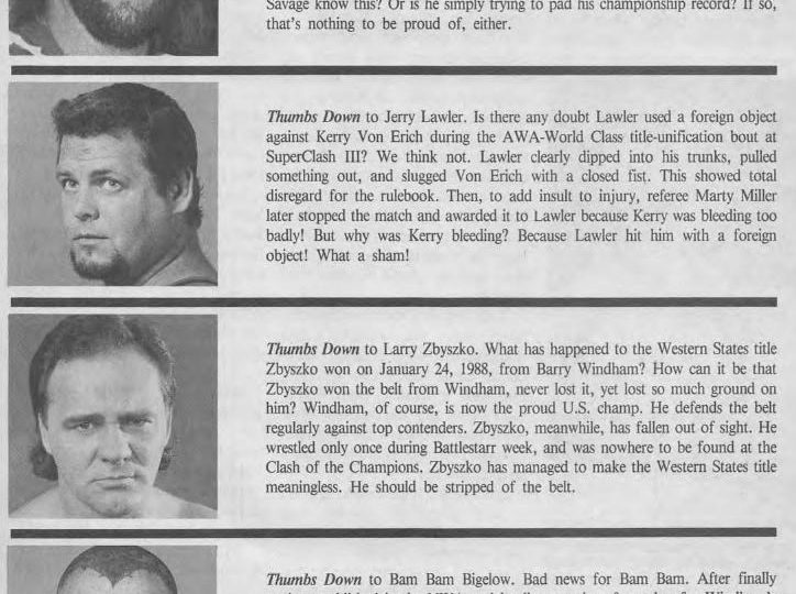 Next, You Asked Us, The Wrestler’s communication channel for fans and talent. (Maybe Scott should start this on the blog and write fake answers from wrestlers.) Kevin from Staten Island asks Bob Backlund, “When are you going to return to wrestling?” Backlund says he’s going to wrestle in Japan soon. After that, it’ll be a wait and see thing. Carlie from Anchorage, Alaska asks Terry Gordy, “Do you plan to annihilate that lummox Bam Bam Bigelow and prove you’re the real Bamm Bamm?” Gordy says the two of them have already met in the ring. “But it don’t matter if you spell it with one m or two, it’s about what you do with your fists, and I think I proved I deserve the name.” Dimitre from Blackfoot, Idaho asks Sting if he’ll wrestle Lex Luger for the NWA title if Lex wins it first. Sting says that’s a tough question, but he’d probably ask Lex for a strictly scientific match. (I would later see the two wrestle for the title in person, and it was not that sort of match.) Greg from Campbellton, New Brunswick asks Dave Rosenbaum how to become a wrestling journalist. Dave says, “Start off by writing often. Maybe take a creative writing course and get involved with your school paper. It’s important to know a lot about wrestling and be enthusiastic about it, but you won’t be able to share that enthusiasm with your readers if you can’t write well.” Sandy from Philly asks Paul Ellering why it took so long for the Road Warriors to dump losers like Sting and Dusty. Paul says, “Sometimes, my friend, it’s difficult to see the forest for the trees. We had to step back and see the big picture.” Finally, Carolan from Stoughton, Massachusetts asks AWA President Stanley Blackburn why in the event of a controversial title match he doesn’t hold the title up and hold a tournament. Blackburn says “For that action to be taken, I have to convene a meeting with the AWA Board of Directors, a difficult task as they are always travelling all over the globe. Also, tournaments are time consuming. It’s much easier to simply sign a rematch and let the combatants settle matters between them in the ring. Only in the most extreme and controversial cases will I request the title be held up.”