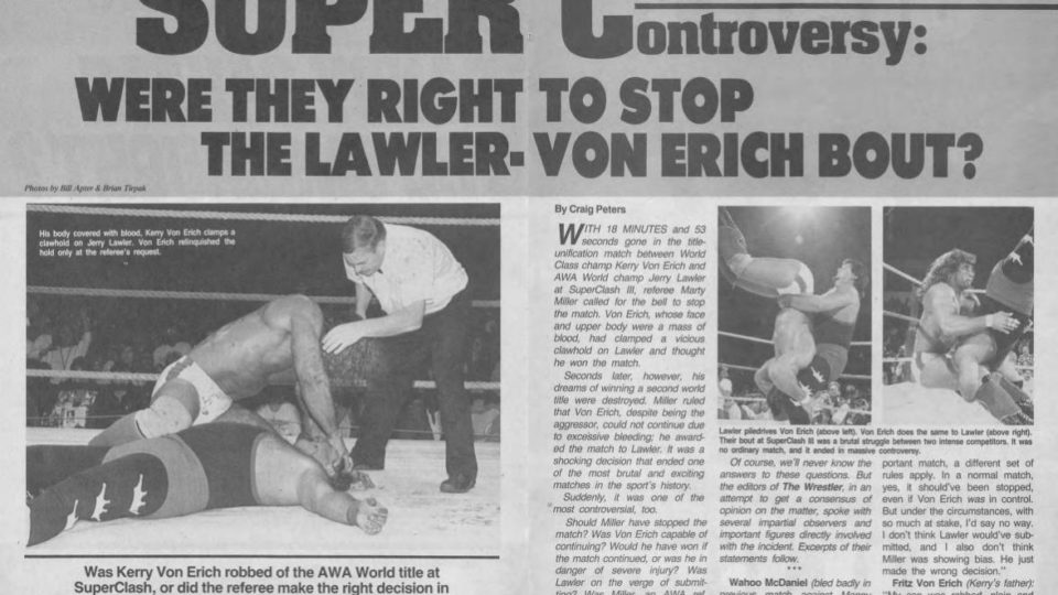 Next, were they right to stop the Jerry Lawler-Kerry Von Erich bout at SuperClash III on account of blood? Wahoo McDaniel says, “The safety of the wrestlers is important, but when you’re talking about such an important match, a different set of rules apply. Under the circumstances, I say no way.” Fritz Von Erich says, “My son was robbed, plain and simple. We Von Erichs have the guts to bleed a little and come back. What made me laugh was how, afterward, Blackburn and Verne Gagne were talking about how good a decision referee Marty Miller made. Of course they thought it was a good decision! They made it for him!” Tommy Young says, “If you remember, I was the referee when the guy from the Maryland Athletic Commission ordered me to stop the Ric Flair-Lex Luger match in Baltimore in July. Personally, I wouldn’t have stopped that match, but I had no choice. But as a referee, I have a responsibility to assure the health of the participants. There’s no way you can say a wrestler is a good judge of whether he should be allowed to continue. I don’t care what’s on the line, health and safety are top priorities.” Stanley Blackburn says, “Mr. Von Erich was bleeding terribly, and the match had to be stopped. Mr. Von Erich no longer has his belt, but at least he has his health.” Gordon Solie says, “I’ve been watching this sport a long time, and I could count on one hand the number of matches I’ve seen stopped because of blood. Look, this is a tough sport, and it’s for tough men. If Von Erich was that weak, Lawler would have been able to pin him. As it was, Von Erich had the iron claw on Lawler. I’m not sure the ref made the right move.” Frank Dusek, World Class official says, “I don’t see how they could stop the match when Kerry was in total control. And if they had to stop it, just declare it a draw!” Kerry Von Erich says, “Blackburn saw that his AWA man was about to lose the title and did something about it. I bled an awful lot for nothing.” Jerry Lawler says, “I honestly believe if the match wasn’t stopped, Kerry would’ve bled his way into the intensive care unit. I would hope that an official would do the same for me if I was in that position. By the way, there was no way I was going to submit. You just don’t give up the World title that easily.” Referee Marty Miller says, “Very simply, I was told to stop the match if one of the participants was bleeding too heavily. There was no conspiracy, just common sense.”