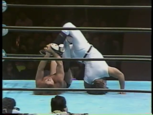 This is Asai’s last appearance before becoming Ultimo Dragon and Emilio’s last appearance before he joins Los IRA. Asai lands on his feet after a high-angle hip-toss and the affectionate “wooo!!” from the crowd is a reassuring start. This crowd was starving for some good lucha. Asai nails his delayed Monkey Flip, following with a nifty headscissors, a fake-out in the ropes to cause Emilio to move in position for a diving senton off the apron. No wonder EMLL and SWS were throwing bags of money at this guy. Emilio locks in a Boston Crab so both men can get a breather, leading to Asai land his sweet tilt-a-whirl backbreaker. Emilio locks in a leg lock so complicated looking I had to ask Simon Gotch what it was. I’ll put the answer here if he responded!