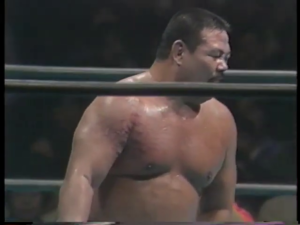 Crowd sees the bruising and starts making the same noise an audience would make watching a horror film when Tenryu starts kicking away. And I mean full-on kicking and stomping in the corner to poor Hara. He has enough and thrusts Tenryu outside and over the guardrail again so Hara can catch a break. Instead, Tenryu climbs back in and blocks a lariat with an enziguri, directly to Hara’s injury. With Hara on his knees, Tenryu starts kicking field goals directly into Hara’s shoulder which is now uglier than Cody Rhodes’ (His tattoo, not his pec tear). Hara is too strong though and continues to stand there taking them so he can lariat Tenryu for a close two as the commentator sounds like this: “aaaaAAAAAaaaahhh”
