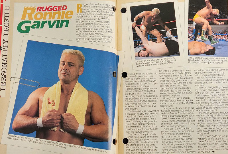 Next, Personality Profile introduces us to Rugged Ronnie Garvin, a newcomer to the WWF who, we’re told, is a veteran of the mat wars. His favorite move is the Garvin stomp, a tactic which, we’re told, requires a scientific background. (It’s probably preferable to the Garvin go-behind.) “You can’t just expect to kick your way to victory,” he says. “The Garvin stomp is always thought out before I use it. I make sure to stomp key nerve endings. And I use the sole of my boot, making the tactic very effective and very legal.” We’re also told that Garvin has incredible stamina and can wrestle nonstop for hours. Right now, he has his sights set on Greg “The Hammer” Valentine.
