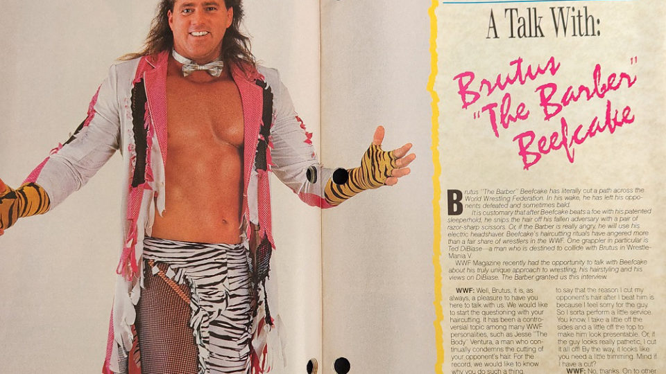 Next, an Interview with Brutus “The Barber” Beefcake. Beefer says the interviewer looks like he could use a trim but the magazine reporter declines. (Funny note: back in the late 1980s, I thought Ed Leslie really was a barber and cut hair in his spare time. After all, Gorilla was always taking about how Brutus had gotten a diploma from world famous stylist Sal Fodera! Little did I know that was a reference to a joke vignette where Fodera oversaw Brutus giving a mannequin a bad haircut.) Brutus says he doesn’t cut hair as a punishment, but as a service. When he defeats an opponent, he feels bad for the loser and wants to do something for the poor guy. The interviewer then moves on to examining Brutus’s move-set, first talking about the high knee and then talking about the sleeper. Brutus says he’s used the high knee as a finishing maneuver, but the sleeper is even better because he’s mastered the science behind it. Asked who he’d like to use it on, he says, “I’m so glad you asked me that question. The answer is simple: the Million Dollar Man.” The interviewer then asks what he thinks of the fans buying the new Brutus Beefcake merchandise in the WWF Merchandise Catalog, such as the Brutus “The Barber” beach towel. Brutus says the fans mean everything to him, and who knows, someday they may open their own barbershops. The interview then closes with Beefcake once again offering to cut the interviewer’s hair.