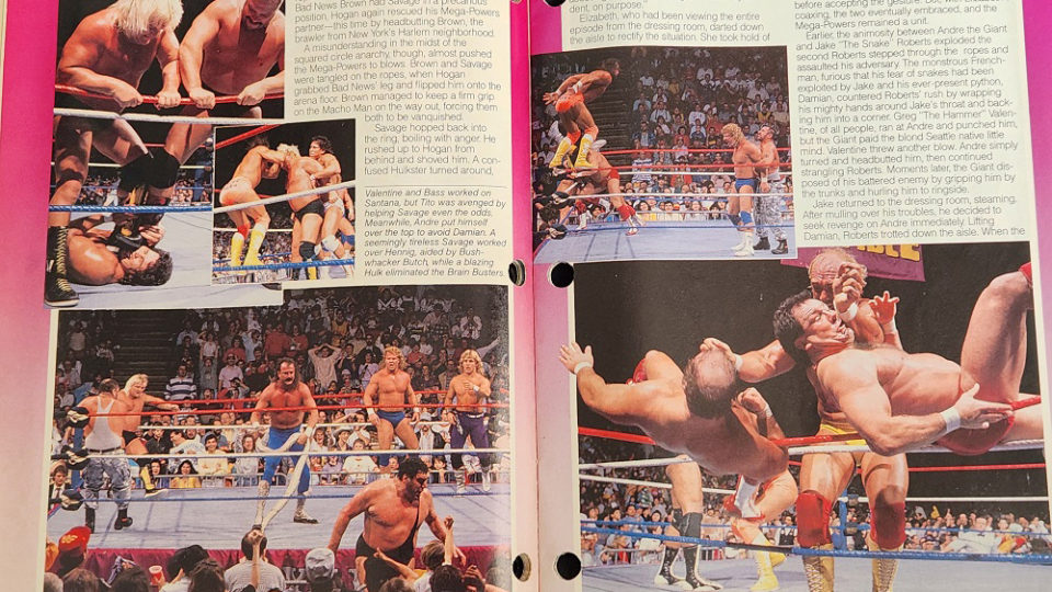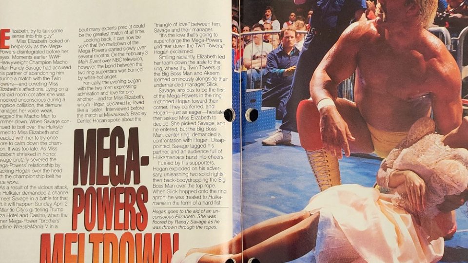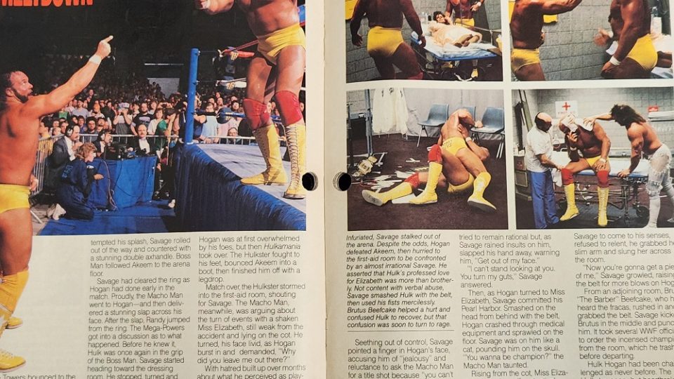 The article, it should be noted, includes some large photos of match but has to keep the images of the backstage drama small because the magazine had no photographers back there and relies on paused images from the analogue television feed for Savage’s attack. Hogan has since challenged Savage to a title match at WrestleMania, and Savage has accepted.