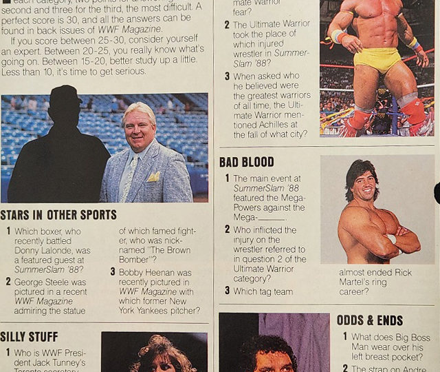 The answers: Stars in Other Sports: Sugar Ray Leonard, Joe Louis, and Rick Rhoden. Silly Stuff: Emily Hotbody, red, and a suit of armor. The Ultimate Warrior: nothing, Brutus Beefcake, and Troy. Bad Blood: Bucks, Ron Bass, and Demolition. Odds & Ends: a badge, left, and his dog, Rusty.