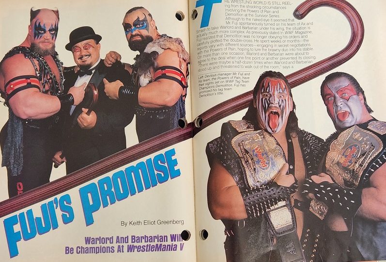 And we also get an article about The Powers of Pain, who will team up with Mr. Fuji to take on Demolition at WrestleMania V for the tag team championship. (I guess if the Powers win, it’ll be the Freebird rule then?) We learn that the Demolition wasn’t obeying Fuji’s orders in the summer of 88, but Fuji was able to convince the Powers of Pain to do things his way with promises of a tag team championship reign. Now Fuji has to come through for them.