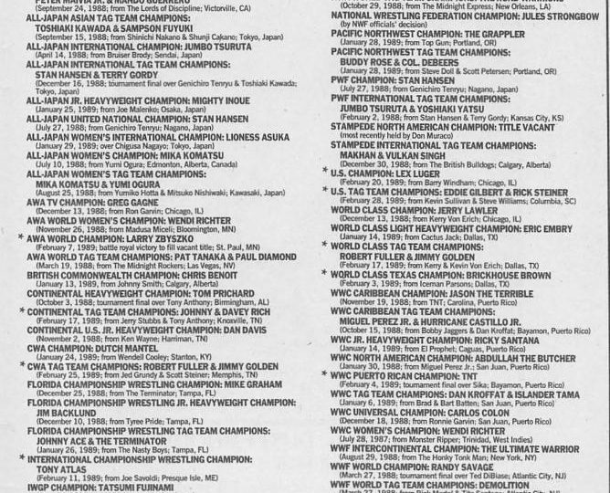This week, we look back at an issue of Inside Wrestling that went to press March 3, 1989 that sold for $1.95 in the U.S, $2.50 in Canada, and £1.35 in the U.K. In this issue, we look at a wrestling landscape shaken up by new AWA and NWA champions, plus we’ll get bonus Observer Newsletter coverage. Let’s go straight to the ratings and the roll call of champions, and we’ll take a quick look at the ages of the top five stars in each major wrestling company.