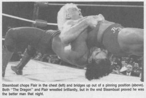 Eddie flashforwards to the Chi-Town Rumble. “For nearly 23 minutes, Flair and Steamboat made fans forget that the WWF has a stranglehold on the sport. They gave new NWA chieftain Ted Turner a reason to cheer, and perhaps to invest more money. They gave the performance of their lives.”