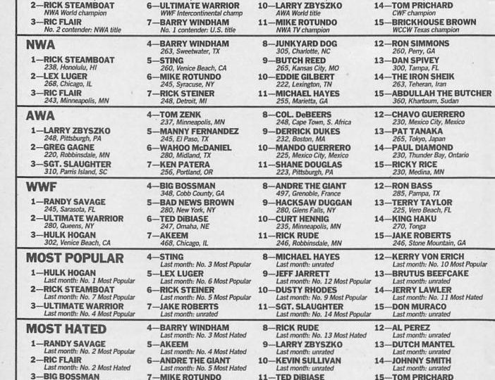 Next, we look at Names Makin’ News with Bill Apter. Three titles changed hands at the NWA’s Chi-Town Rumble. Rick Steamboat upset Ric Flair for the NWA World championship, Lex Luger downed Barry Windham for the U.S. title, and Mike Rotundo regained the NWA TV belt from Rick Steiner. In another match, Jim Cornette and his Midnight Express defeated Paul E. Dangerously and his Midnight Express, with the latter team featuring Jack Victory substituting for Dennis Condrey. Rose was pinned, and as per the match’s stipulation, he must leave the NWA. “He knew what he was getting into,” says Dangerously, “so now he’s history.” (Well, not really, thanks to a legal loophole.) Dangerously has already pivoted to a new tag team, the Samoan Swat Team, which has just jumped from World Class to the NWA. Other NWA newcomers include Dan Spivey, who has joined Kevin Sullivan’s Varsity Club, and the Iron Sheik.
