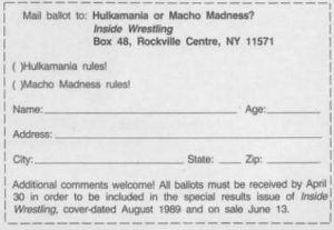 Then we move on to an article that asks fans to vote on whom they support following the breakup of the Megapowers: Macho Man or Hulk Hogan? A ballot is included: