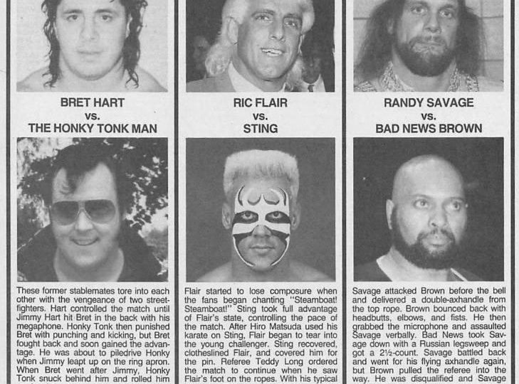 Then there’s Maury Dowd from Leroy, New York who says Flair’s attempt at making a secret pact with the Varsity Club (as mentioned in the April issue) shows that he can’t go it alone and is now desperate without having Tully, Arn, and J.J. Dillon around. “I think it’s all over for Flair,” she says. “Even the Varsity Club can’t help him now.”
