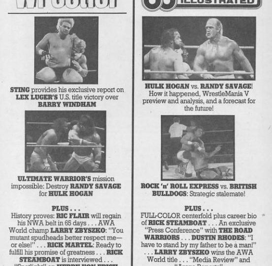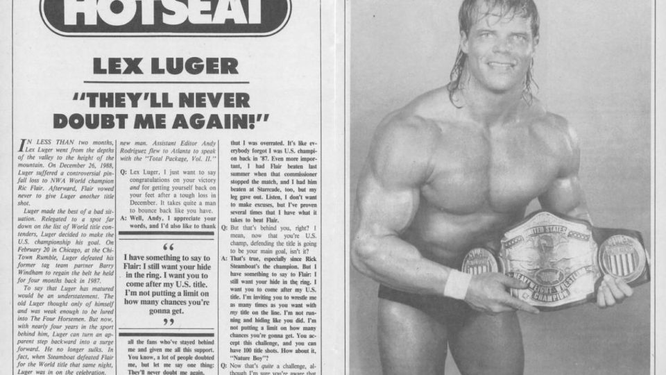 Next, a Hotseat Interview with Lex Luger, who finally got back at his former tag team partner, Barry Windham, defeating Windham for the U.S. Championship at the Chi-Town Rumble. Luger says that after losing to Flair in December, everybody began doubting him and seemed to forget that he was U.S champion before, but now he’s a champion again, and this time he’s doing it on his own. “But I have something to say to Flair: I still want your hide in the ring. I want you to come after my U.S. title. I’m inviting you to wrestle me as many times as you want with my title on the line.” (And indeed, this match would happen at house shows in 1989 as well as later at Clash of the Champions XII in 1990.) When asked if he’d like to wrestle Ricky Steamboat for the World title, Luger says, “I’d like to. I think everybody would find it fascinating. U.S. champion versus World champion: both belts on the line. That could be the match of the century. In reality, though, they probably won’t let me wrestle Steamboat. But Steamboat won’t have the belt forever, and I’ll be around a long time. When the year 2000 rolls around, I will still be putting on the tights. So there’s plenty of time for me to win the big one.”