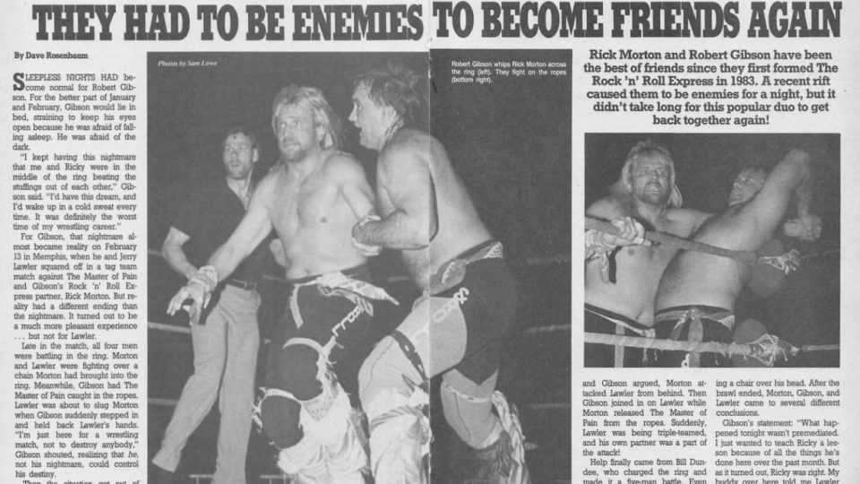 And now to an article about the Rock ‘n’ Roll Express, where we learn that Ricky Morton teamed up with The Master of Pain to take on Robert Gibson & Jerry Lawler. During the course of the match, however, Lawler and Gibson got into an argument, at which point Gibson and Morton reunited and teamed up with The Master of Pain (Mark Calaway) to triple-team Lawler. Lawler says he’ll never trust either Ricky or Robert again. “I thought Robert Gibson was a better man than that, but I should have realized that the Rock ‘n’ Express comes as a team, and it was a mistake to team with Gibson.” Meanwhile, the magazine can’t make out who the good guys and bad guys are because fans in different areas are reacting to the wrestlers in different ways.