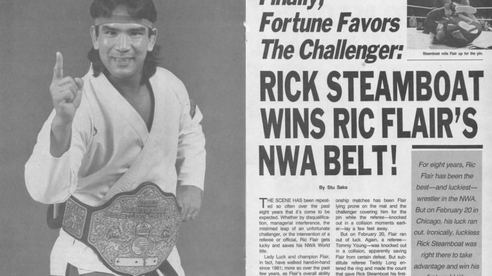 Breaking news! Ricky Steamboat is the new NWA champion, and the magazine gives us coverage of the Chi-Town Rumble match. There’s also a new AWA champion, as Larry Zbyszko won the title in a battle royal in St. Paul.
