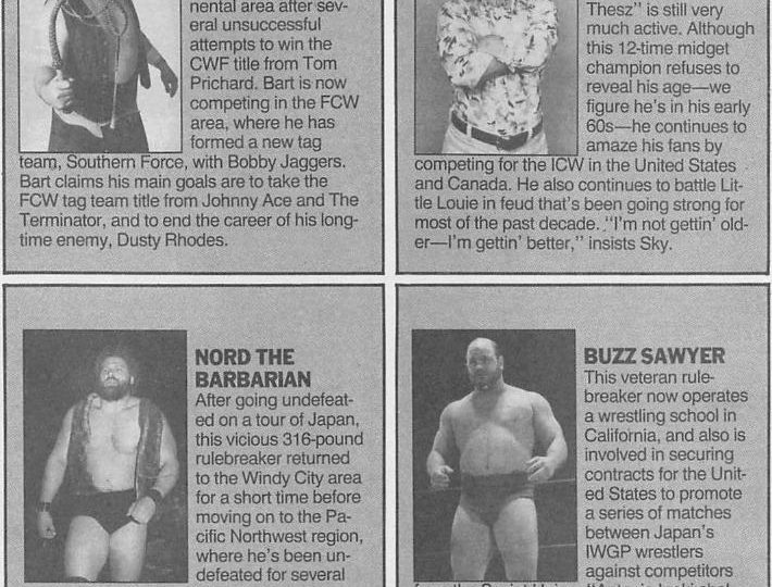 Next, Behind the Dressing Room Door with David Rosenbaum, where Dave reports that Bam Bam Bigelow has changed federations. “What else is new?” Dave asks. He says Bam Bam has basically gone full circle. He started out in the CWA, a regional federation, then went to World Class, Japan, the WWF, and the NWA before signing with Florida Championship Wrestling, another regional promotion. Dave says Bam Bam’s excuses about not getting treated right are getting old, and guys like Kendall Windham and Sam Houston must look at Bigelow, who has “star” written all over him, with disgust over how he’s wasting such potential they wish they had.