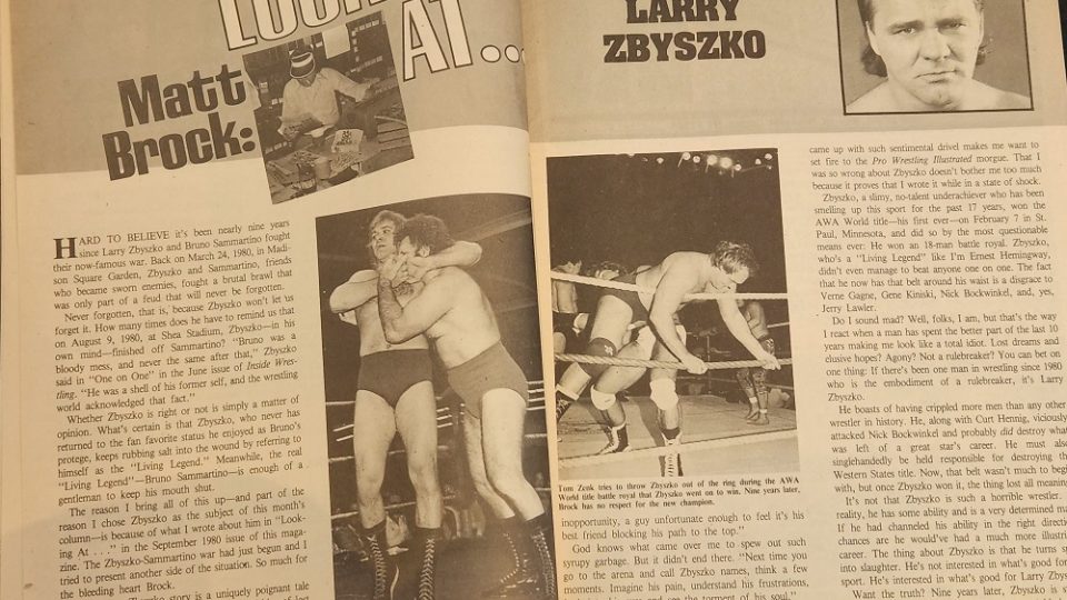 Next, Matt Brock looks at Larry Zbyszko. Brock says that he’ll never forget August 9, 1980 when Zbyszko wrestled Bruno Sammartino at Shea Stadium. The fans were firmly on Bruno’s side, Brock was sympathetic toward Larry. In an article from 1980, he wrote, “The Larry Zbyszko story is a unique poignant tale of frustration and pain, of embattled friendship, of lost dreams and elusive hopes. Imagine what Zbyszko went through, the agony of declaring war on his best friend. He’s an ambitious man frustrated by inopportunity, a guy unfortunate enough to feel it’s his best friend blocking his path to the top.” Matt looks back at the article and says it’s garbage. “The fact that I came up with such sentimental drivel makes me want to set fire to the Pro Wrestling Illustrated morgue.” He says today he knows that Zbyszko is a slimy, no-talent underachiever who has been smelling up the sport for the past 17 years, and the fact that he now has the AWA belt around his waist is an insult to Verne Gagne, Gene Kiniski, Nick Bockwinkel, and even Jerry Lawler. Zbyszko spent 1988 single-handedly destroying the Western States title by taking it off the wrestling map, and now he’s doing the same in 1989 for the AWA championship. It’s not that he’s a horrible wrestler, it’s that he’s not interested in what’s good for the sport. He’s just interested in Larry Zbyszko. (Damn, Matt was cranky!)