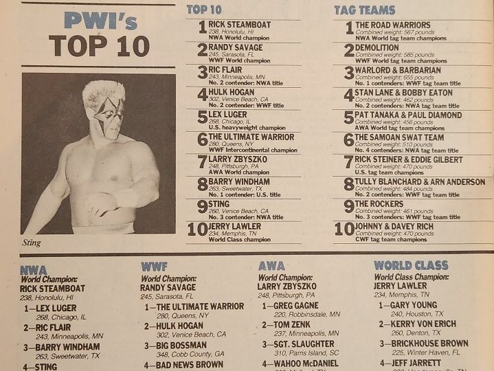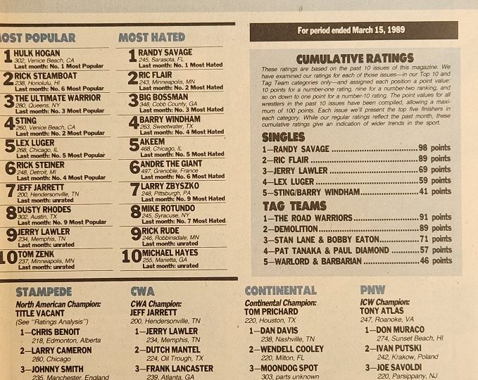 This week, we look back at an issue of PWI that went to press March 15, 1989 and sold for $2.25 in the U.S, $2.95 in Canada, and £1.50 in the U.K., plus we get bonus coverage from The Wrestling Observer! In this issue, the magazine asks fans to vote for the winners in the first round of a dream tournament they’ve set up, Matt Brock bashes his least favorite World champion, and we get a new number one in the ratings. Let’s get right to the latter…