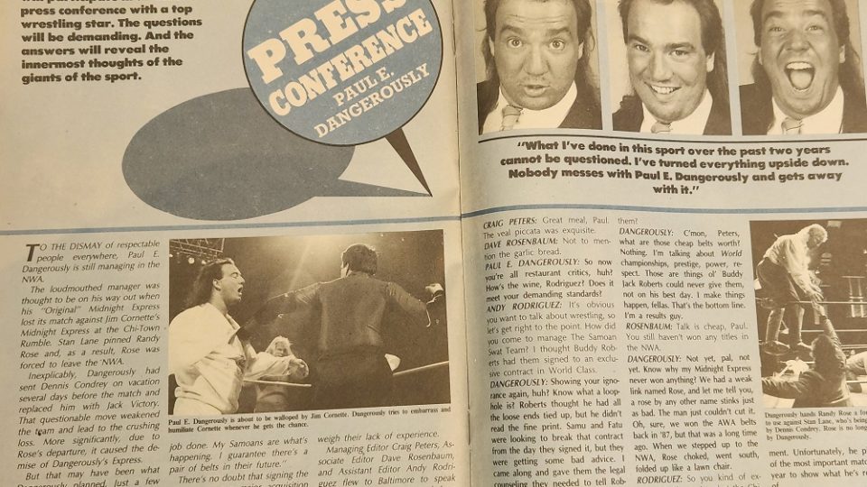 Next, a Press Conference with Paul E. Dangerously, who has transitioned from managing the defunct Original Midnight Express to managing the Samoan Swat Team. (And thus began Paul’s association with the Anoaʻi family.) Dangerously says he knew the Original Midnights were finished, and it was time to move on to the next big thing. He was able to sign the SST by promising to lead them to real championships as opposed to settling for cheap belts in Texas, and he says that one day he’ll be managing all the champions, including the World champion. (As if this guy would ever manage a World champion.)