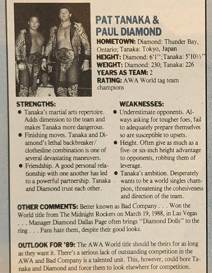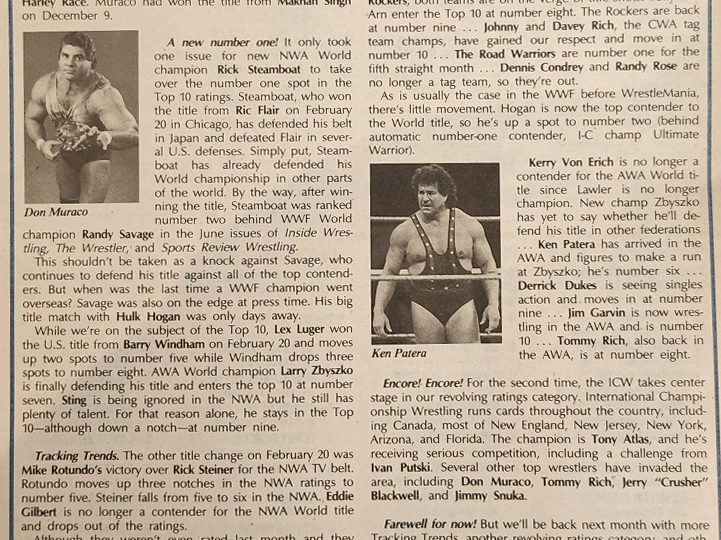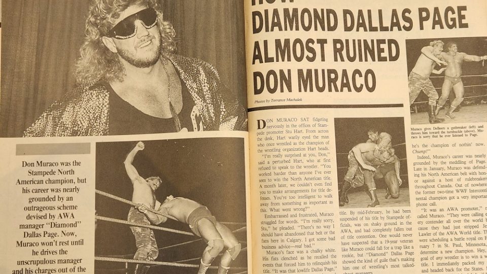 Next, an article about how AWA’s Diamond Dallas Page ruined Don Muraco’s career, which is a curious mix of Kayfabe and reality with PWI making up a story to give Page some heat and make Muraco look less flakey. Muraco had revived his career in Stampede Wrestling and was North American champion before failing to defend the title and being stripped. Meanwhile, he no-showed after being advertised to compete in the AWA’s battle royal for the vacant AWA championship. It turns out it was all part of a plot by Dallas Page. The Diamond One talked Muraco into coming down to wrestle for the vacant AWA title but talked him out of participating in the battle royal with the promise of a one on one match against the winner. “Why take on 17 other guys for the title when I can get you a match against the winner?” It turned out it was all a ploy by Page to keep Muraco out of the battle royal and increase the chances of Col DeBeers, Pat Tanaka, and Paul Diamond—all managed by Page—of winning. Meanwhile, Muraco, who had been training in the states for the battle royal, failed to defend the Stampede title within the mandated 30 day period and was stripped.